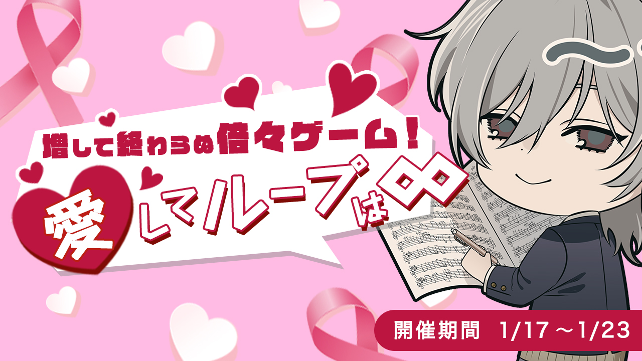 本日から『 増して終わらぬ倍々ゲーム!愛してループは∞ 』が…